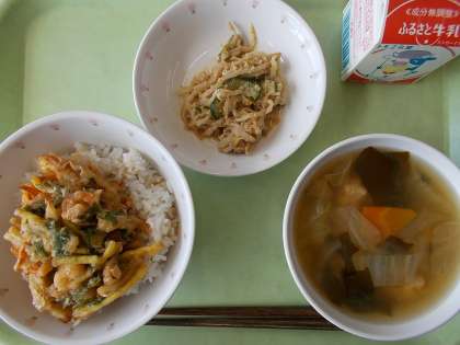 献立は、かき揚げ丼、牛乳、みそ汁、ごま酢あえでした。