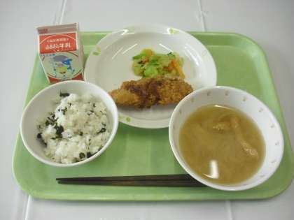 献立は、わかめごはん、牛乳、白身魚のフライ、みそ汁、野菜のカレードレッシングあえでした。