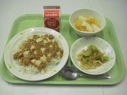 献立は、麻婆豆腐丼、牛乳、中華サラダ、杏仁豆腐でした。