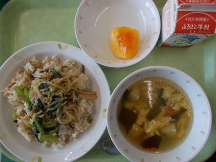 献立は、ビビンバ、牛乳、わかめスープ、くだもの(柿)でした。