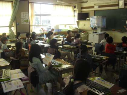 授業の様子(10月14日) 公開日 2021/10/14 更新日 2021/10/14 今日のできごと 1年生が、音楽の時間に、ミニキーボードを使って、「つきみ」の曲の練習をしました。 指の使い方を教わり練習しました。