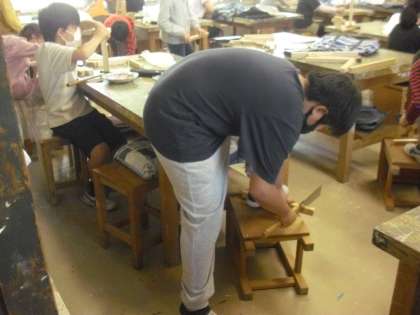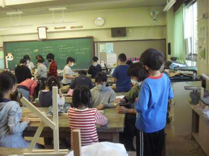 4年生が、図工の時間に、ひまらや学級の児童と、「もくもくイニシャル」の木工作の作品づくりをしました。