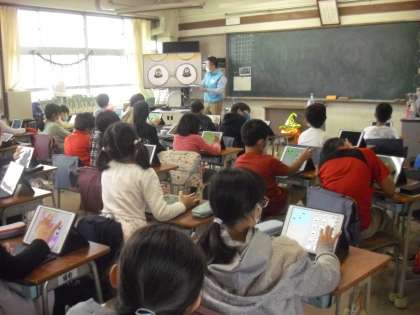 4年生が、タブレットのアプリ「ビスケット」を活用して、プログラミング学習の一環として、もぐらたたきゲームのシステムづくりをしました。