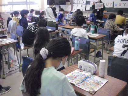 授業の様子(10月19日)その6 公開日 2021/10/19 更新日 2021/10/19 今日のできごと 3年生が、外国語活動の時間に、ALTの先生と、英語のアルファベッドを使った言葉さがしをして、その読み方を学習しました。
