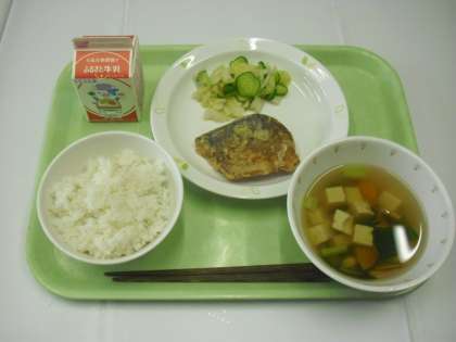 献立は、麦ごはん、牛乳、さばの立田揚げ、白菜のひとしお、すまし汁でした。
