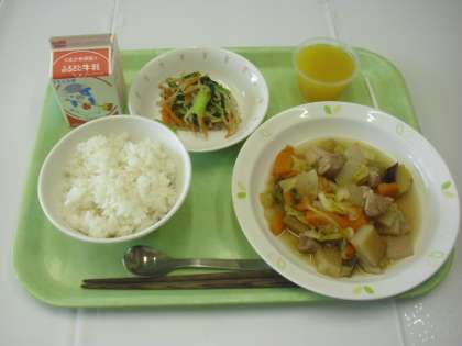 献立は、麦ごはん、牛乳、豚肉と大根のうま煮、野菜のからしじょうゆ和え、みかんゼリーでした。