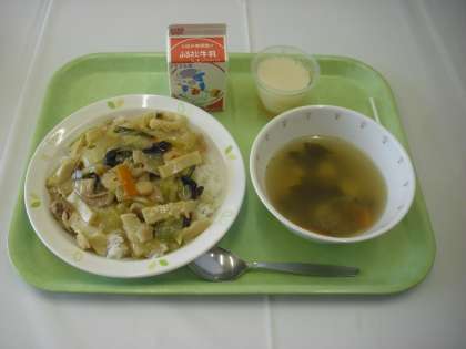 献立は、中華丼、牛乳、わかめスープ、杏仁豆腐でした。