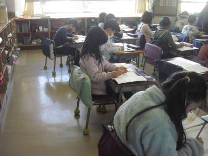 1年生が、算数の時間に、一年間の算数の学習を振り返り、練習問題を解きました。
