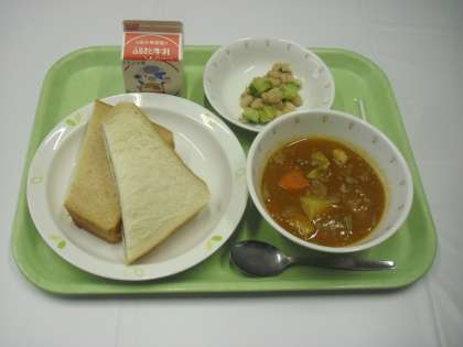 献立は、二色サンド、牛乳、ハンガリアンシチュー、ビーンズサラダでした。
