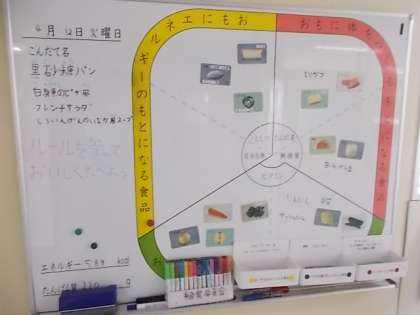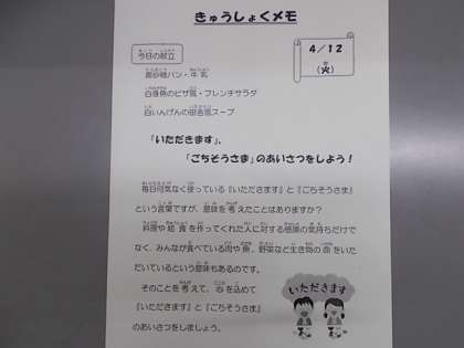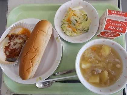 献立は、黒砂糖パン、牛乳、白身魚のピザ風、フレンチサラダ、白いんげんの田舎風スープでした。