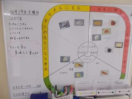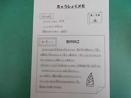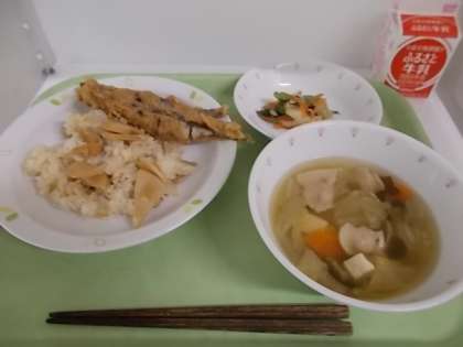 献立は、たけのこごはん、牛乳、ししゃものごま天ぷら、野菜のおかかあえ、豆腐汁でした。