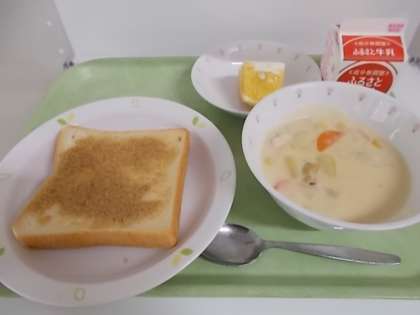 献立は、セサミトースト、牛乳、チャウダー、甘夏みかんでした。