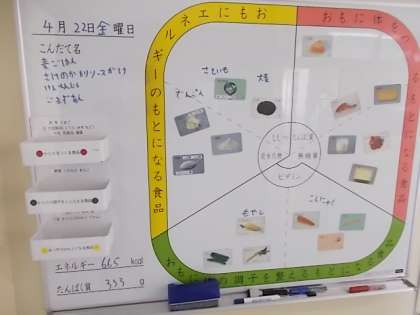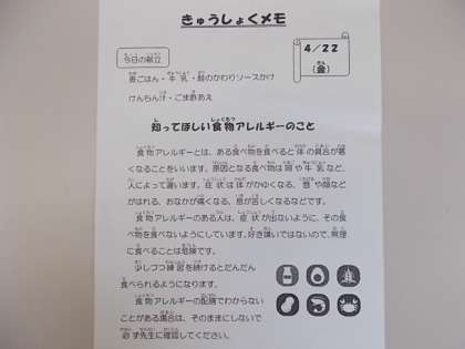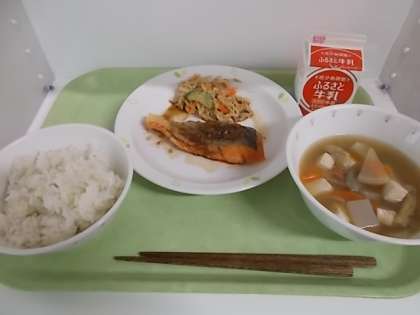 献立は、麦ごはん、牛乳、鮭のかわりソースかけ、けんちん汁、ごま酢あえでした。