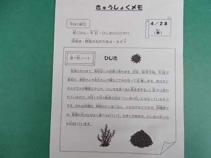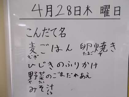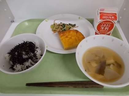 献立は、麦ごはん、牛乳、ひじきのふりかけ、卵焼き、野菜のごまだれ和え、みそ汁でした。