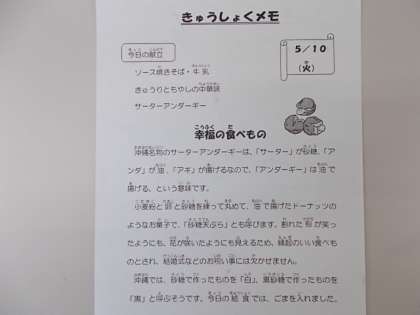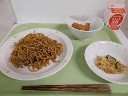 献立は、ソース焼きそば、牛乳、きゅうりともやしの中華味、サーターアンダーギーでした。