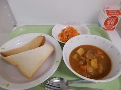 献立は、二色サンド、牛乳、ハンガリアンシチュー、にんじんサラダでした。