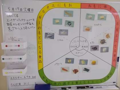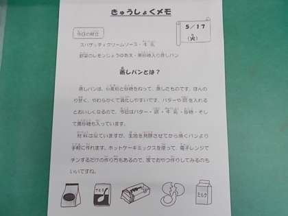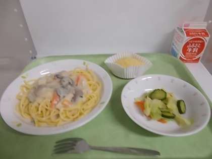 献立は、スパゲッティクリームソース、牛乳、野菜のレモン醤油和え、黒砂糖入り蒸しパンでした。