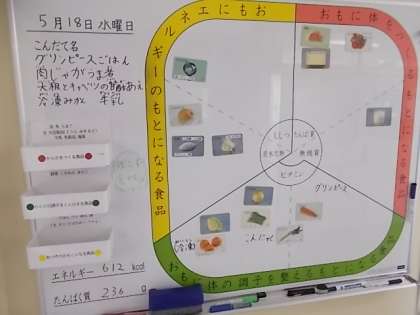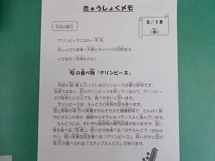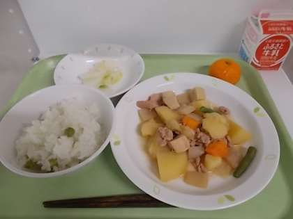 献立は、グリンピースごはん、牛乳、肉じゃがうま煮、大根とキャベツの甘酢あえ、冷凍みかんでした。