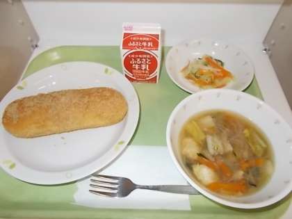 献立は、ごま揚げパン、牛乳、肉団子入り春雨スープ、野菜のドレッシングあえでした。