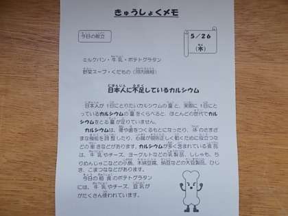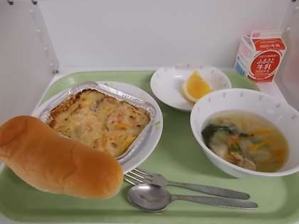 献立は、ミルクパン、牛乳、ポテトグラタン、野菜スープ、果物(河内晩柑)でした。