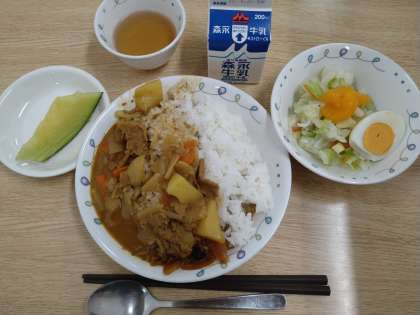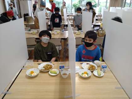 6/15 河口湖移動教室(ひまらや5・6年)13 公開日 2022/06/15 更新日 2022/06/15 今日のできごと 夕食の時間になりました。今晩は、カレーライスとサラダ、メロン、牛乳です。 「いただきます」