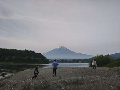 朝の支度をササッとすませ、湖畔へ散歩に行きました。今日も富士山が大きく見えています。
