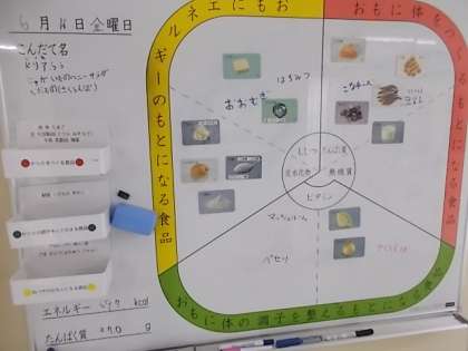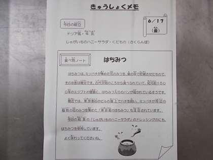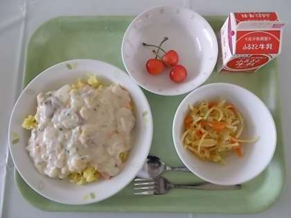 献立は、ドリア風、牛乳、じゃがいものハニーサラダ、サクランボでした。