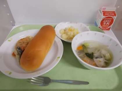 献立は、ミルクパン、牛乳、魚のエスカベージュ、コーンポテト、ベーコンと白菜のスープでした。
