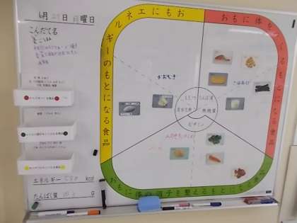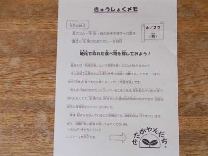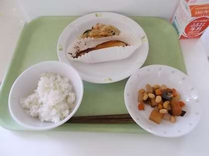 献立は、麦ごはん、牛乳、鮭の味噌マヨネーズ焼き、青菜と油揚げのおひたし、五目豆でした。