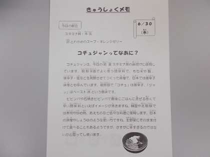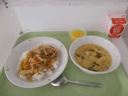 献立は、スタミナ丼、牛乳、卵とわかめのスープ、オレンジゼリーでした。