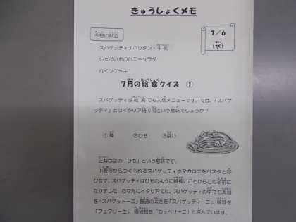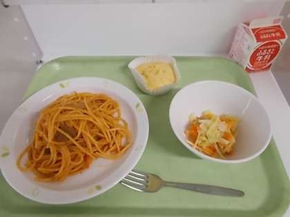 献立は、スパゲッティナポリタン、牛乳、じゃがいものハニーサラダ、パインケーキでした。