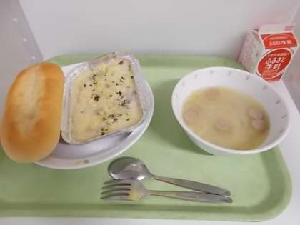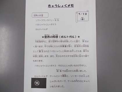 献立は、ソフトフランスパン、牛乳、バカリャウ=コン=ナタス、カルド=ヴェルデでした。