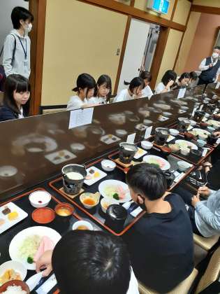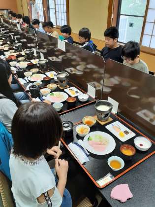 朝食の時間です。食事係の挨拶で、食べ始めました。ハイキングに備え、しっかり食べてくださいね。
