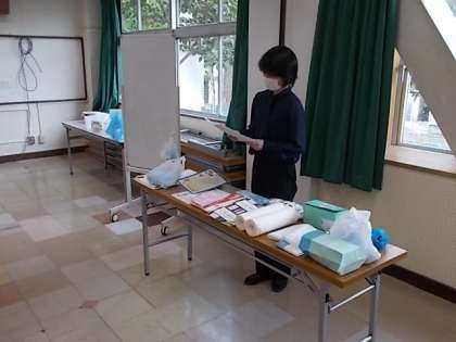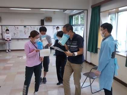 児童下校後、主任養護教諭の指導のもと、いざというときに児童・自身ともにウイルスを防ぎつつ処理に当たれるよう研修しました。