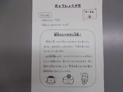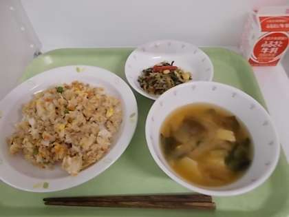 献立は、そぼろごはん、牛乳、大根とひじきのサラダ、みそ汁でした。