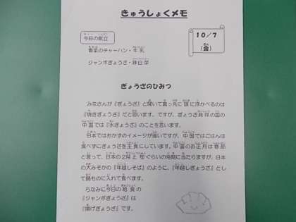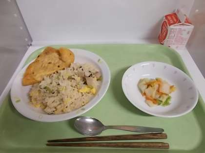 献立は、青菜のチャーハン、牛乳、ジャンボぎょうざ、辣白菜でした。