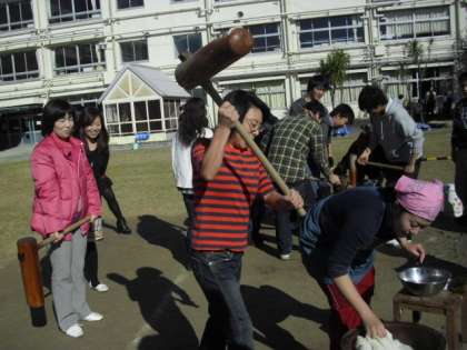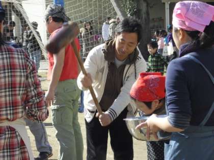 年末恒例、遊び場開放委員会主催の「もちつき大会」が、旭小の校庭で行われました。野沢児童館のご協力のもと、もち米40kgが次々と蒸し上げられ、2つのうすへ運ばれます。旭小とうさんの会他たくさんの方々の手により、つき立てのお餅となり、いそべ餅やきなこ餅として配られました。子ども達はじめ、会場へいらした方々は、「おいしい」「柔らかい」と言いながら、楽しく食べていました。準備から後片付けまで、ご尽力いただきました皆様、ありがとうございました。