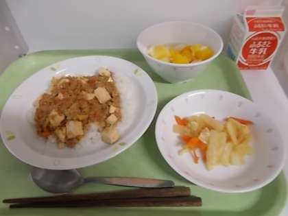 献立は、麻婆豆腐丼、牛乳、中華サラダ、杏仁豆腐でした。