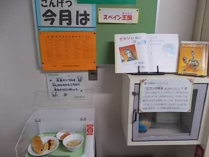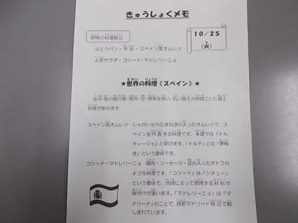 献立は、ぶどうパン、牛乳、スペイン風オムレツ、人参サラダ、コシード・マドリレーニョでした。