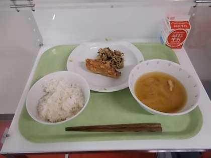 献立は、麦ごはん、牛乳、さばの立田揚げ、野菜の乾物和え、みそ汁でした。
