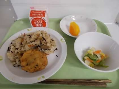 献立は、ひじきごはん、牛乳、手作りさつま揚げ、即席漬け、柿でした。