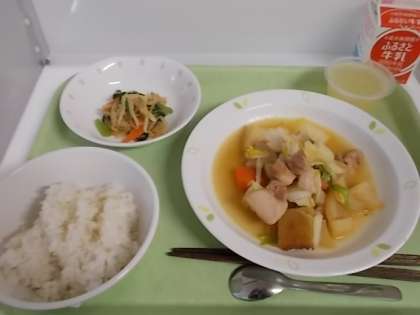 献立は、麦ごはん、牛乳、豚肉と大根のうま煮、野菜の辛子醤油和え、りんごゼリーでした。