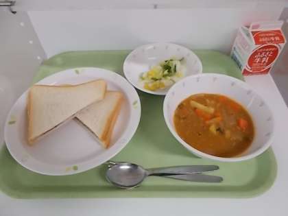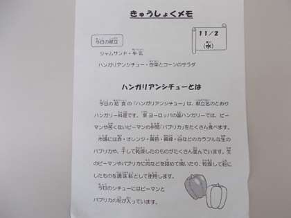献立は、ジャムサンド、牛乳、ハンガリアンシチュー、白菜とコーンのサラダでした。