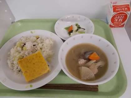 献立は、さつまいもごはん、牛乳、千草焼き、蕪と人参の甘酢和え、三平汁でした。