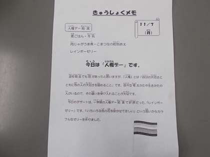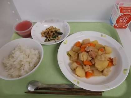 献立は、麦ごはん、牛乳、肉じゃがうま煮、小松菜の乾物和え、レインボーゼリーでした。