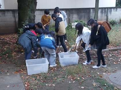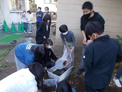 写真は飼育委員会です。カメの冬眠の支度をしている様子です。
