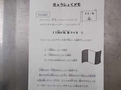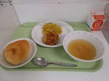 献立は、パインパン、牛乳、ヘルシーハンバーグ、スパゲッティカレーソテー、コンソメスープでした。