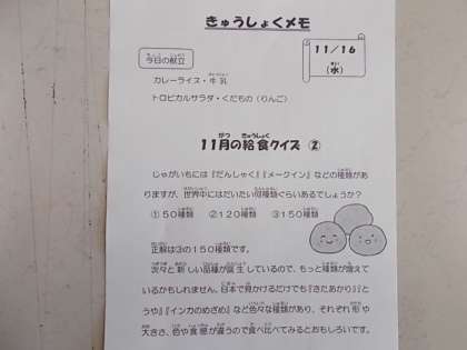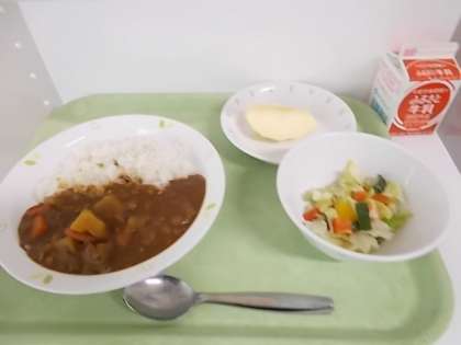 献立は、カレーライス、牛乳、トロピカルサラダ、りんごでした。