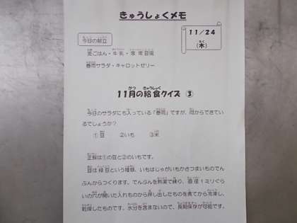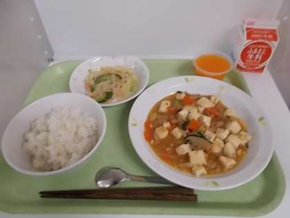 献立は、麦ごはん、牛乳、家常豆腐、春雨サラダ、キャロットゼリーでした。