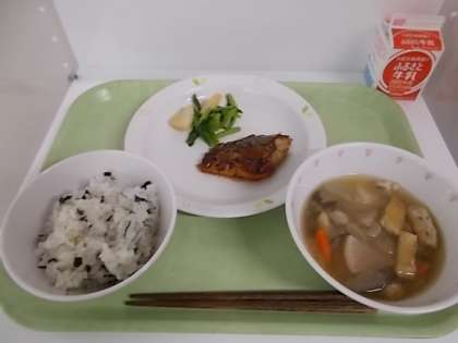 献立は、わかめごはん、牛乳、さばの七味焼き、呉汁、かぶのレモン醤油和えでした。